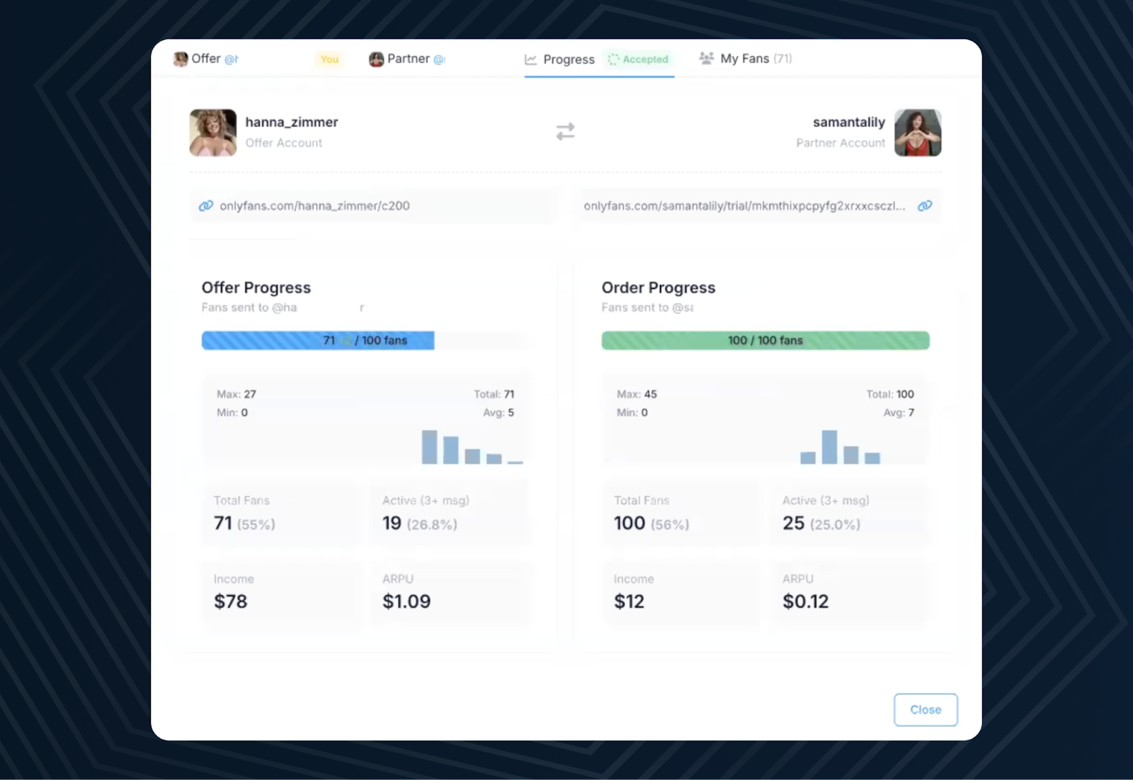 Exchanging fans with another model through the OnlyTraffic CPA platform is a fully transparent and convenient process that saves time, money, and stress. The platform is designed so that models can view and track all key metrics to evaluate and decide on a deal.