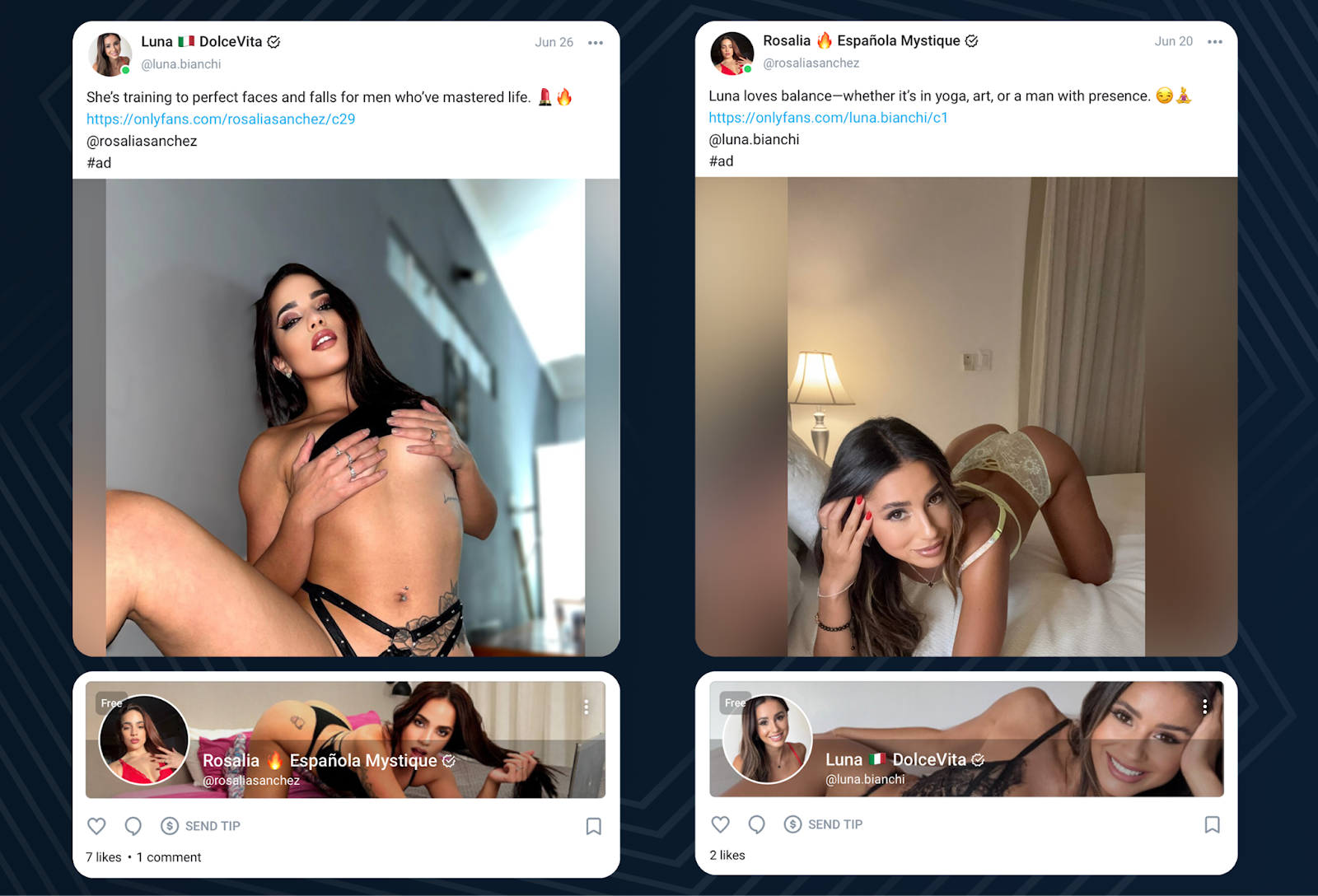 A key for successful mutual promotion is carefully choosing a partner who closely matches your appearance, ethnicity, or niche. For example, promotions are most effective when two Latina creators exchange fans, or when models in the Alt Girl niche swap audiences. In contrast, trying to exchange fans between an Asian model and an Italian model is unlikely to produce good results.
