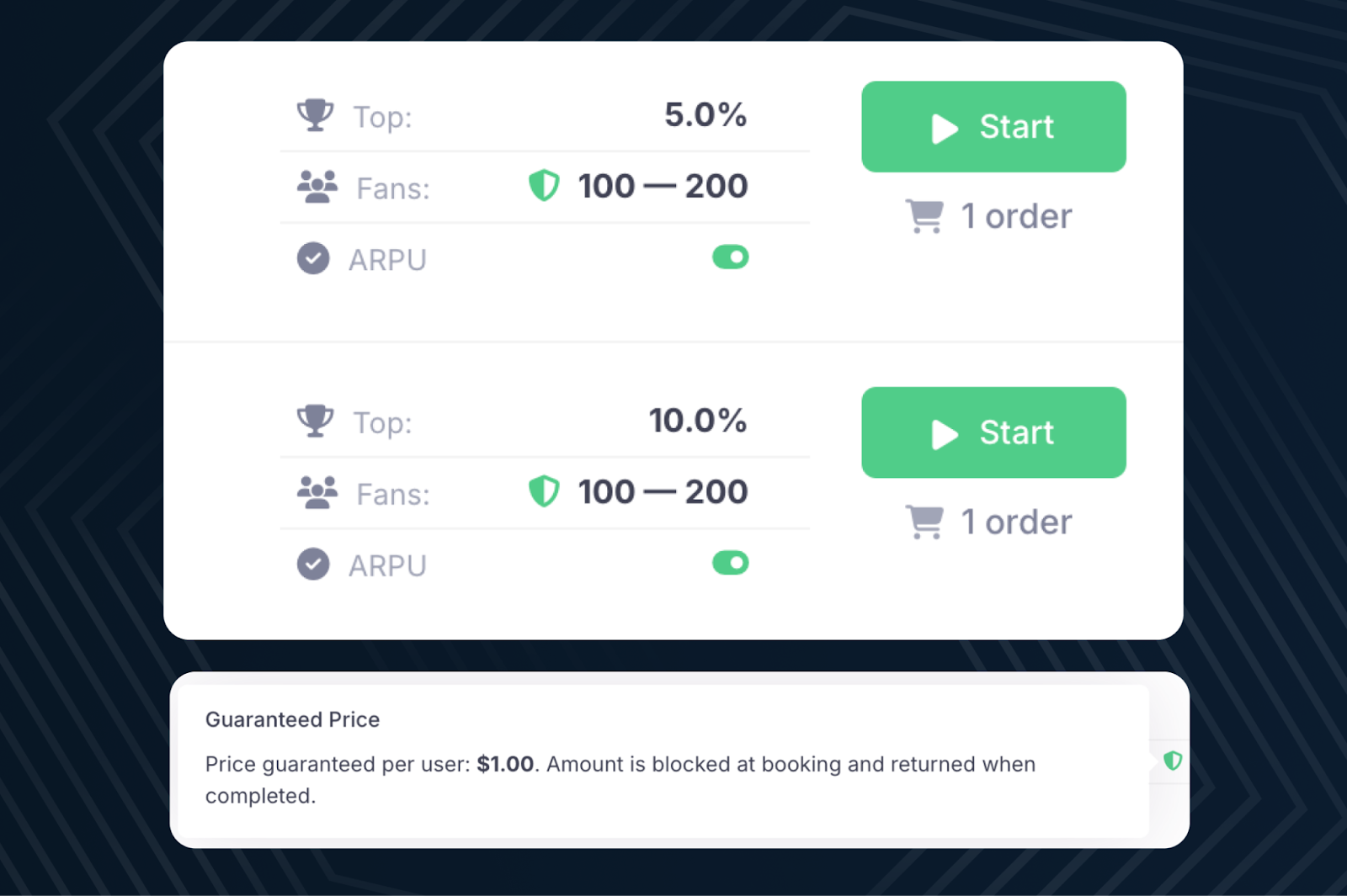 Guaranteed offers are marked on the platform with a green shield icon. This feature helps ensure the safety of your deals: you will either receive the agreed number of fans if everything goes smoothly or get your money back if the other party fails to deliver all the subscribers to your page within the specified time.