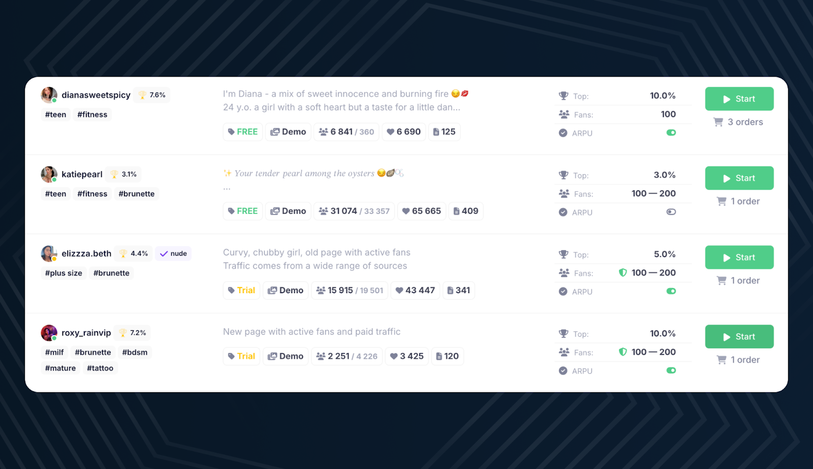 For easier searching, you can use internal hashtags to filter models by niche, top percentage, type of content, and page type. You can also choose only those who have a guaranteed deposit on OnlyTraffic.