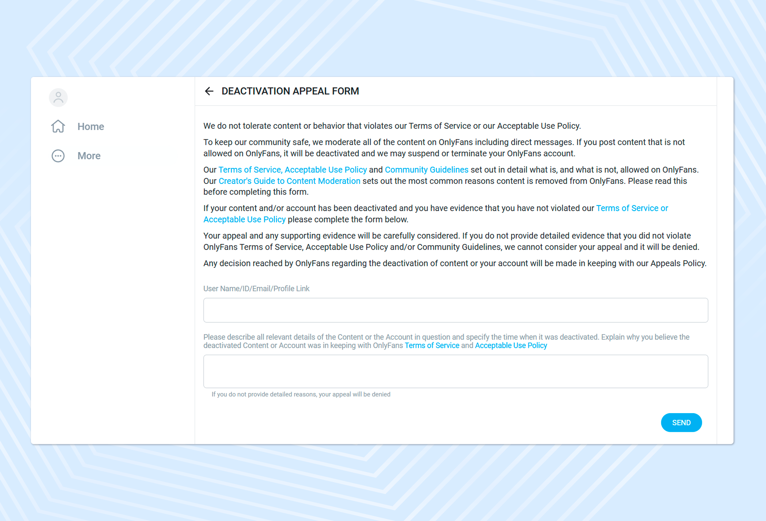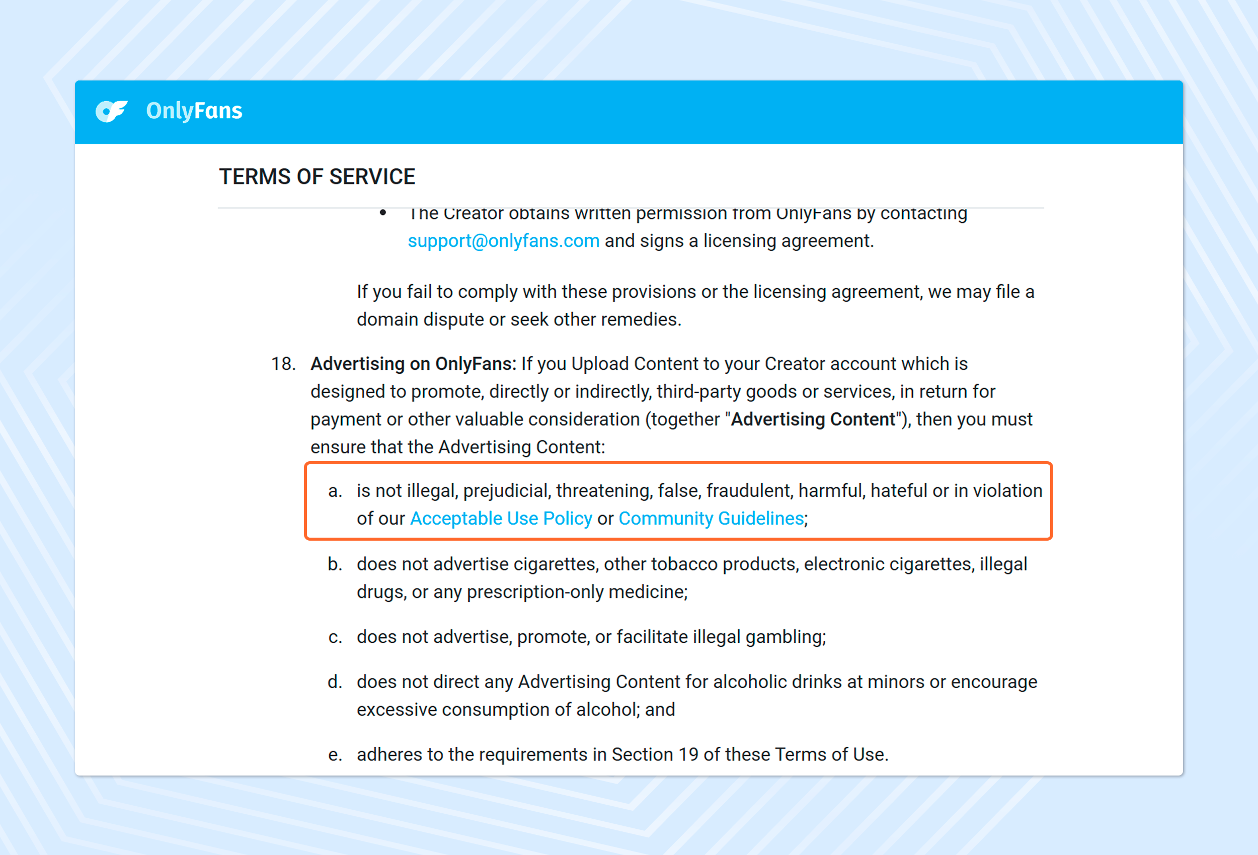 The Acceptable Use Policy is part of the broader OnlyFans policy that specifically covers how you're allowed to use the platform. It includes rules about content, behaviour, and interactions with other users.