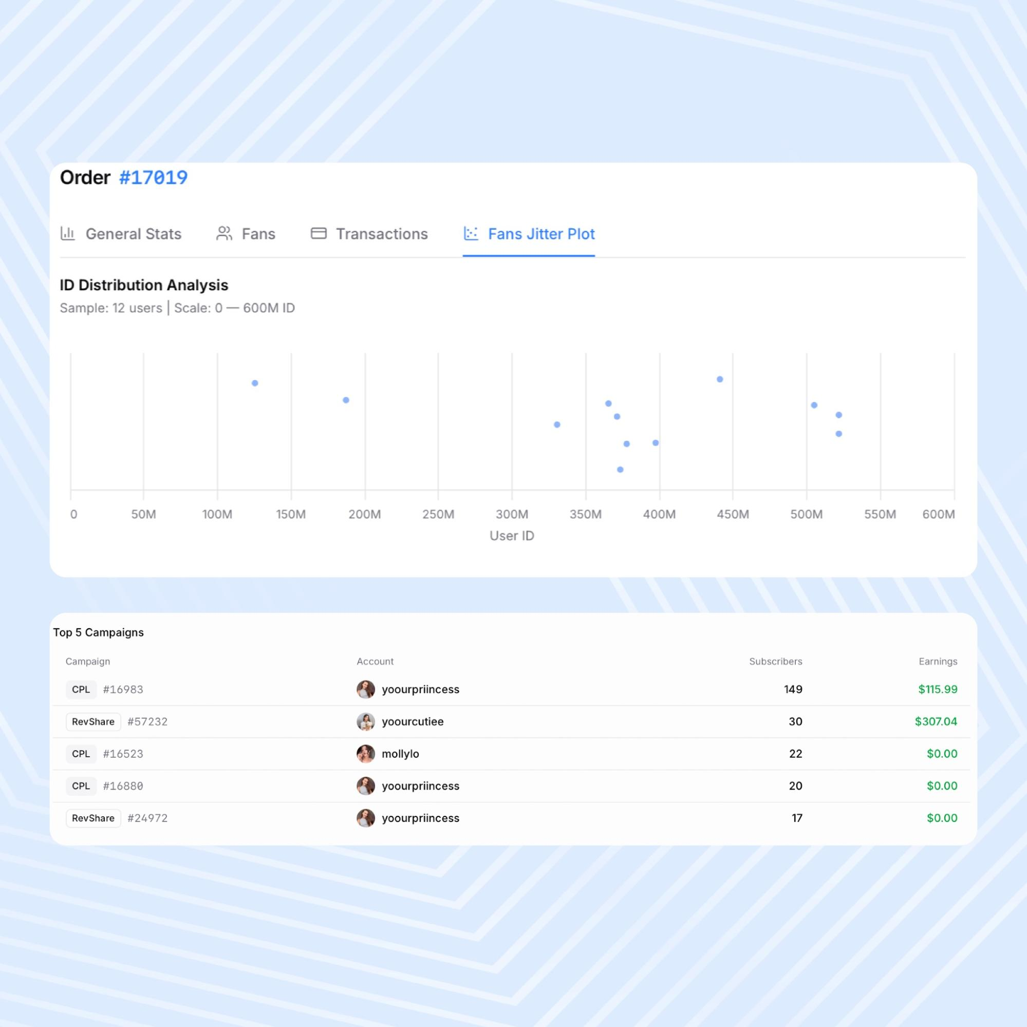 The client dashboard now also includes a chart showing fan distribution. It helps identify suspicious traffic and gives a clearer understanding of overall traffic quality.