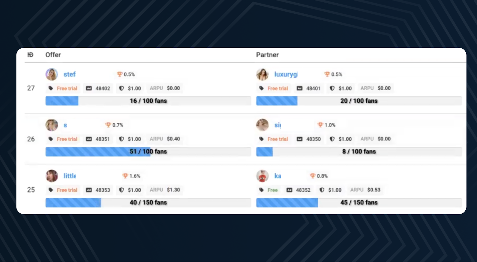 Обмен фанатами с другой моделью через CPA-платформу OnlyTraffic — полностью прозрачный и удобный процесс, который экономит время, деньги и нервы. Платформа устроена таким образом, что модели могут видеть и отслеживать все показатели, чтобы оценивать и принимать решение о сделке.