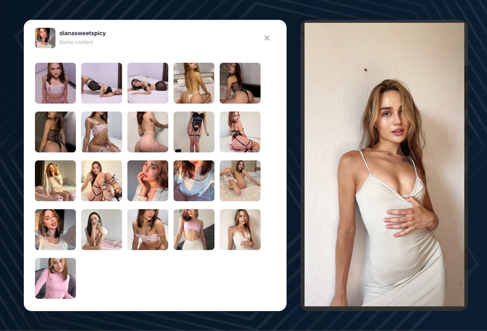 Каждое предложение содержит подробную информацию, которая поможет правильно принять решение. Слева можно увидеть имя модели и ее процент топа, а также тип контента на странице: nude или no nude. В описании видно, что именно предлагает модель, а еще тип страницы (бесплатная или платная), количество постов, лайков и динамику роста подписчиков на странице. Также здесь можно посмотреть примеры контента модели, чтобы понять подходит ли вам ее аудитория: