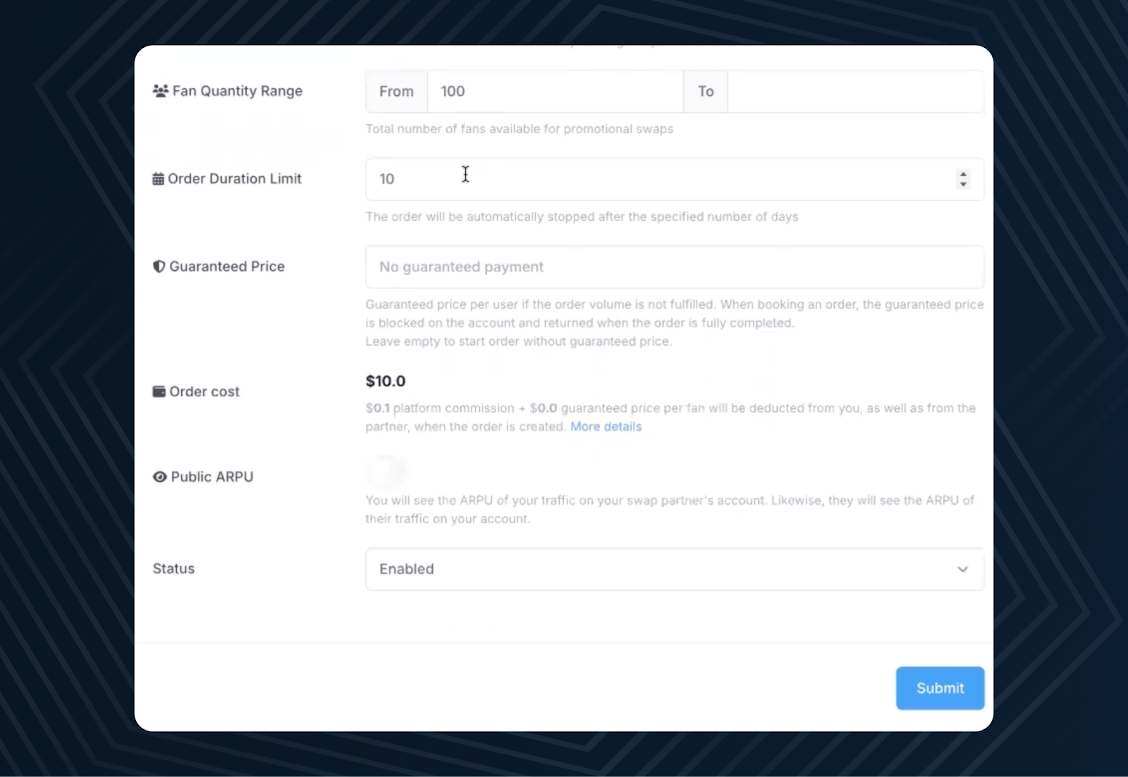 Если у вас платная анкета, то укажите время пробного периода для новых подписчиков. Также выберите тип контента, к которому относится ваша страница и количество фанатов, которыми хотите обменяться. Дополнительно можно транслировать ARPU партнеру, чтобы обе модели могли видеть показатели трафика — это сделает сделку прозрачной для обеих сторон.