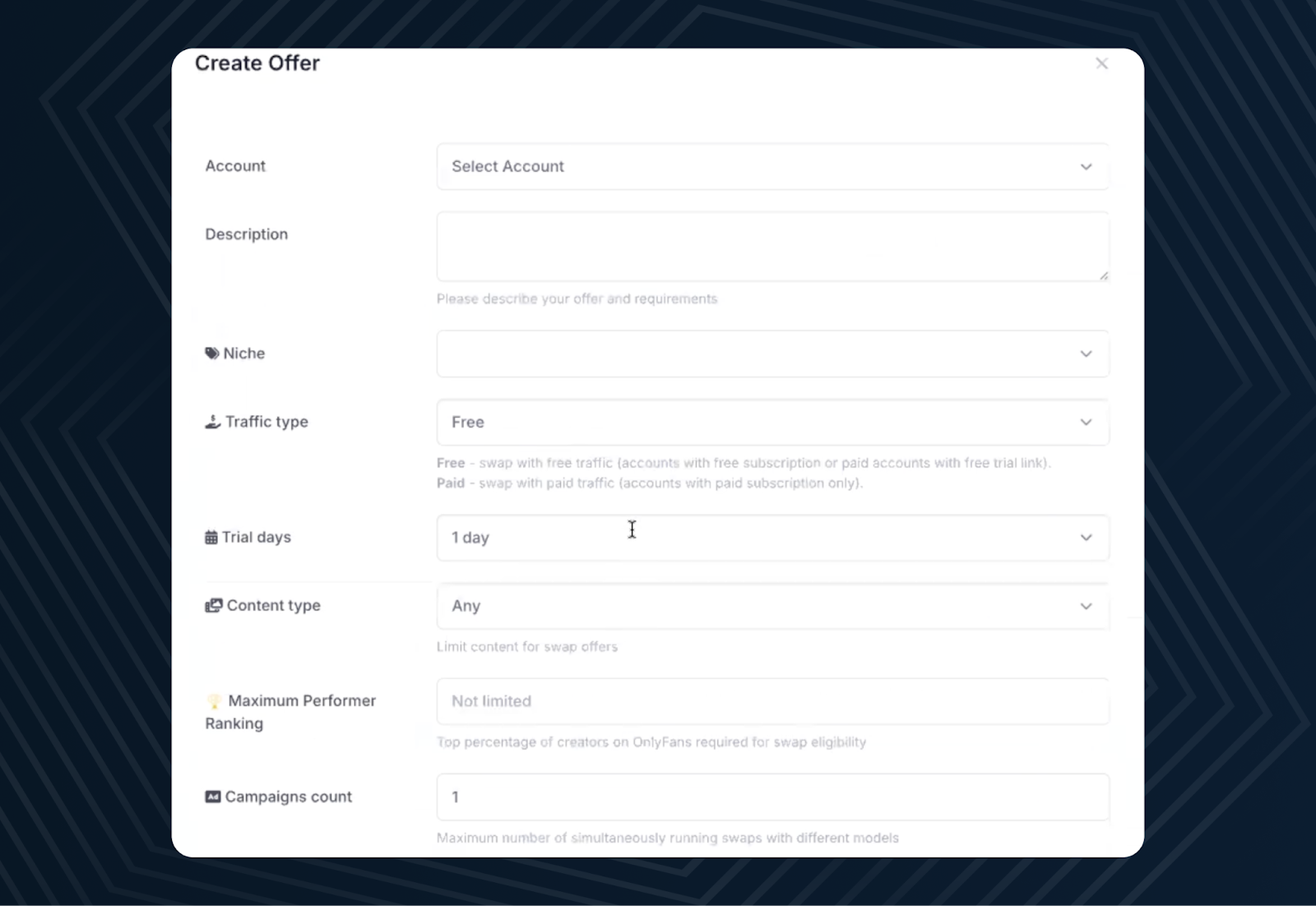 Чтобы разместить свой оффер нужно перейти в раздел «My Offers» на панели слева, а затем нажать на кнопку «Create offer». После этого нужно добавить аккаунт на OnlyFans и авторизоваться через OnlyTraffic, заполнить описание, выбрать нишу и тип желаемого трафика — бесплатных фанатов или платных.
