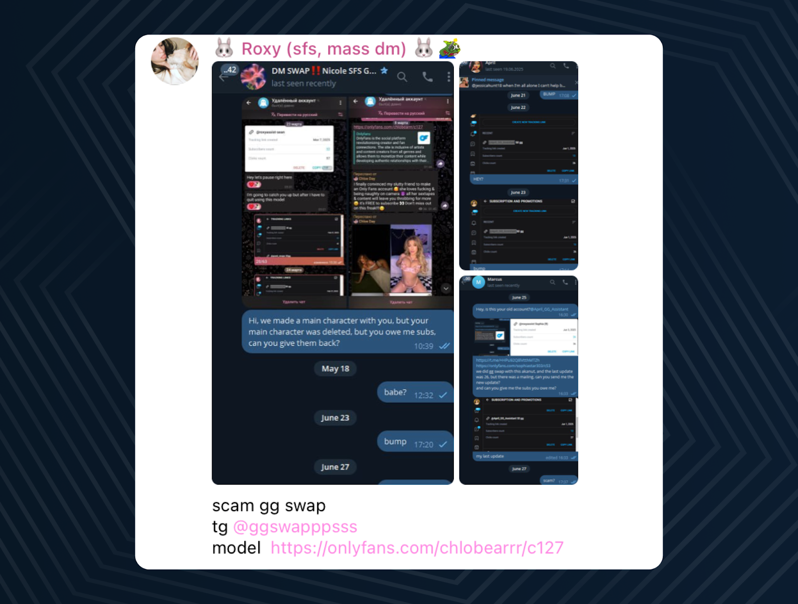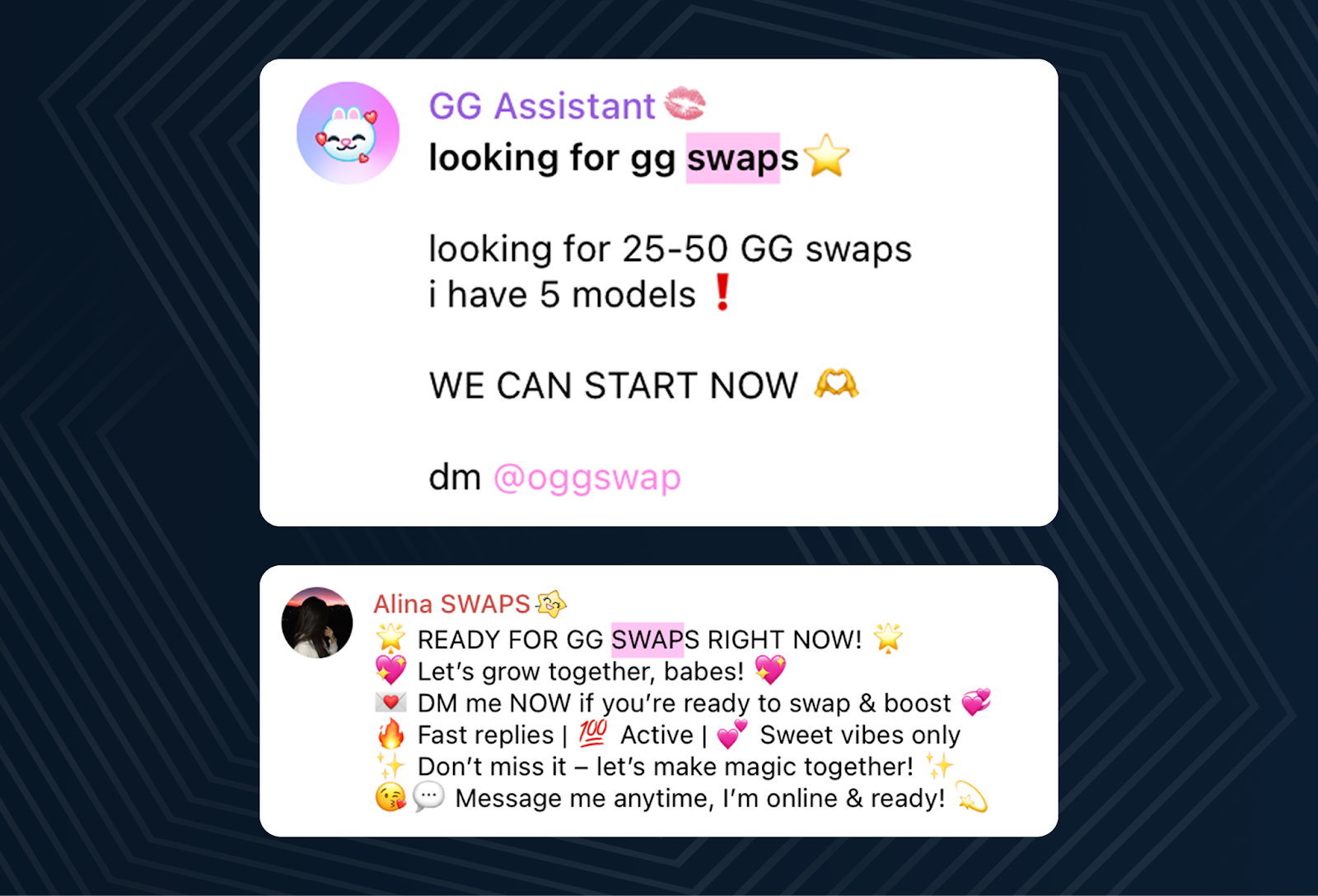 Обычно партнеров для GG Swaps ищут в тематических чатах, где модели публикуют свои предложения и краткий обзор на страницу — список преимуществ, по которым стоит сделать коллаборацию с ними. Чтобы регулярно делать свапы, моделям или их ассистентам, приходиться постоянно сидеть в таких чатах, переписываться и искать новых партнеров.