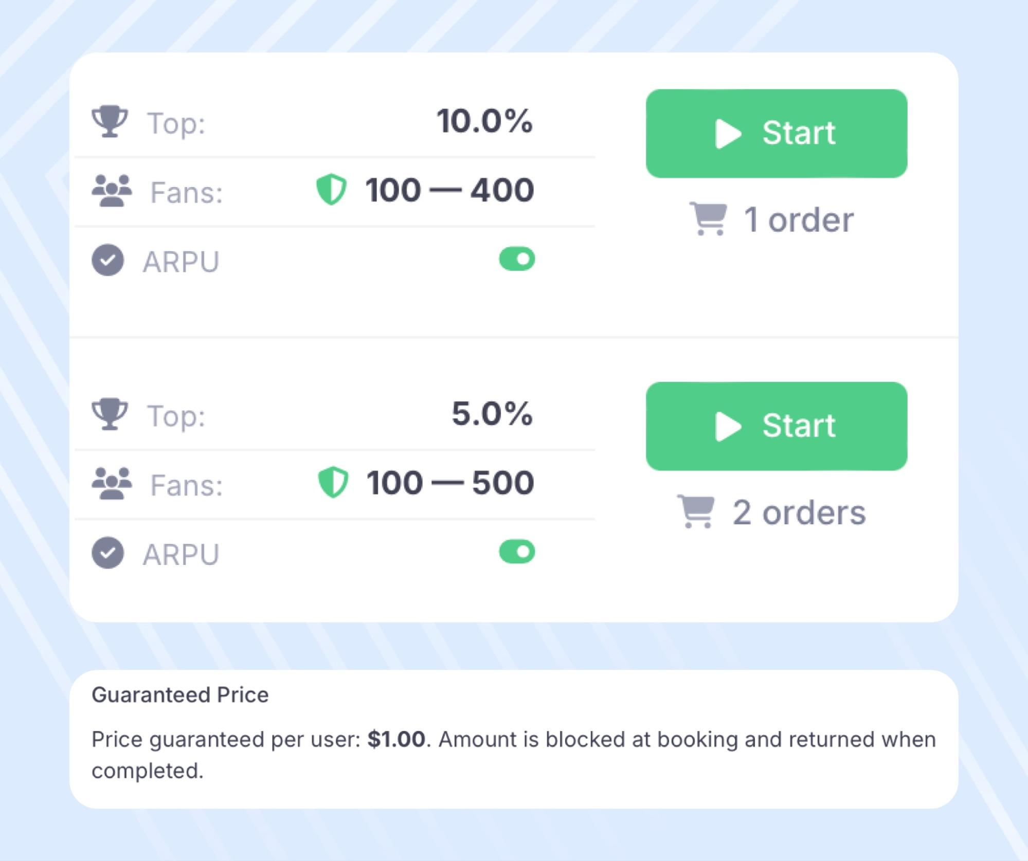 Модели могут делиться статистикой ARPU — это помогает лучше оценить результат, и увидеть реальные цифры. Самое приятное, что на OnlyTraffic есть гарантированные офферы, которые помечены значком зеленого щита. Эта функция помогает защитить обе стороны сделки — модель получит или новых фанатов, или деньги.