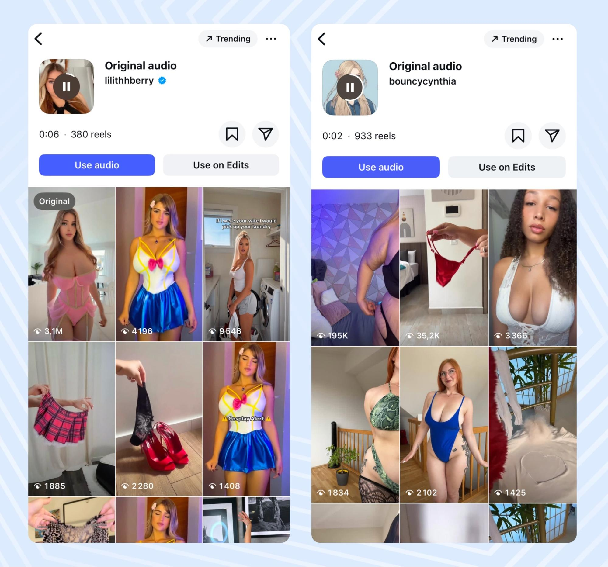 Следите за трендами — не обязательно из адалт-сферы. Это либо вирусный звук или музыка, которую можно использовать в Reels. Можно нажать на название и просмотреть все видео, чтобы понять, какие именно становятся популярными.