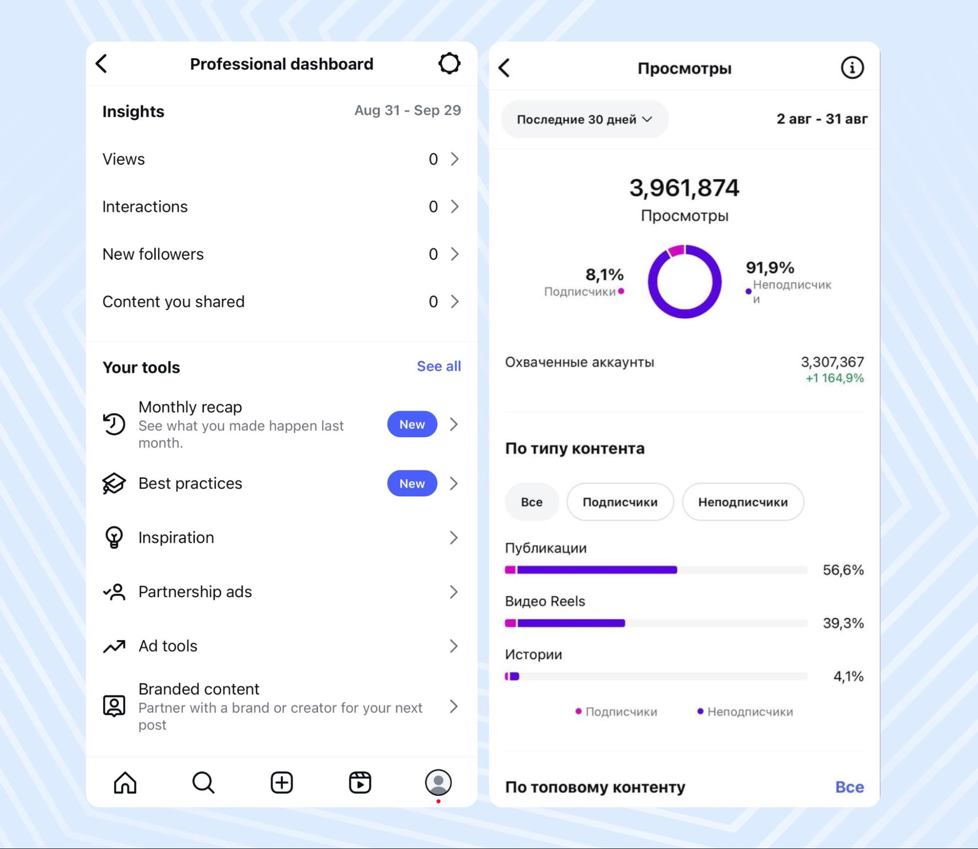 Чтобы понимать потребности аудитории и ее реакцию на ваш контент, нужно тщательно анализировать статистику. Для этого переведите аккаунт в профессиональный — сделать это можно в настройках. Такая функция дает возможность видеть местоположение пользователей, возраст, время просмотра и отслеживать другие показатели.