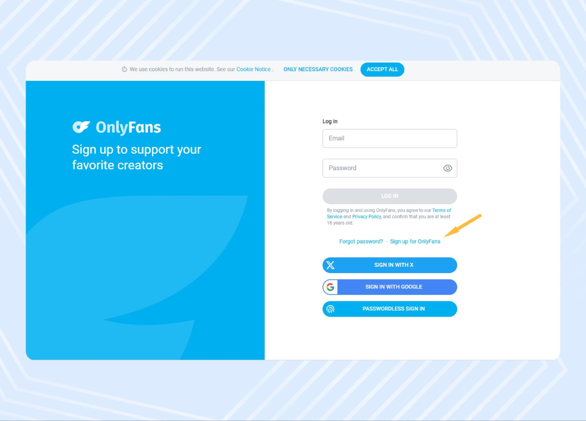 Для начала перейдите на официальный сайт OnlyFans и нажмите «Sign up for OnlyFans». В открывшейся форме укажите свое имя, адрес электронной почты и пароль. Лучше использовать новый адрес электронной почты, чтобы разделить личную жизнь и деятельность на платформе.