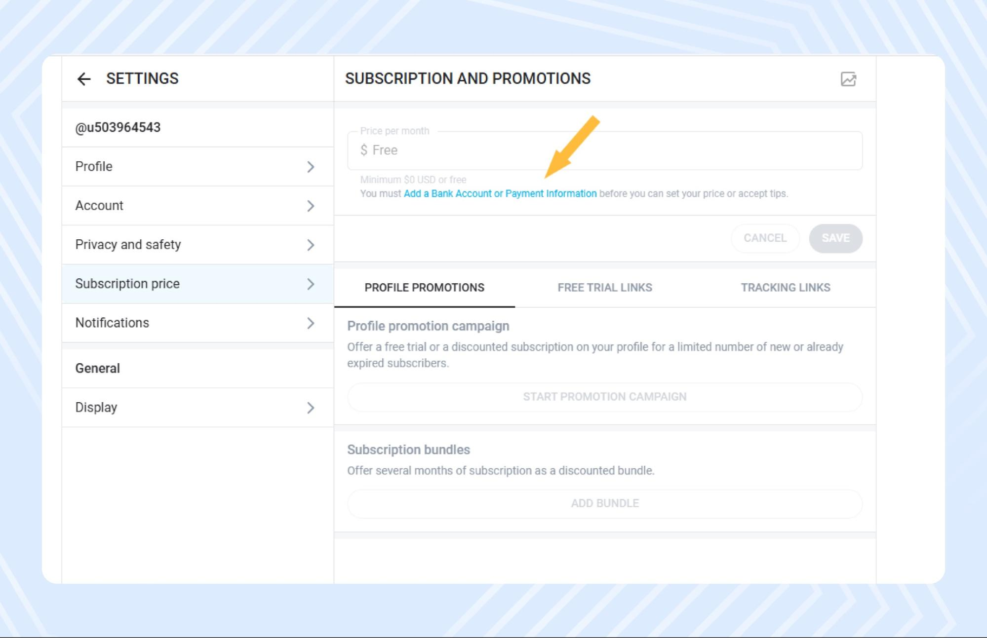 Чтобы начать получать оплату от подписчиков, нужно добавить платежные реквизиты. В личном кабинете вы увидите уведомление «Add a payout method to receive earnings» на панели управления. Если уведомление не появилось, зайдите в «Settings» → «Banking» и нажмите «Add Bank Account».