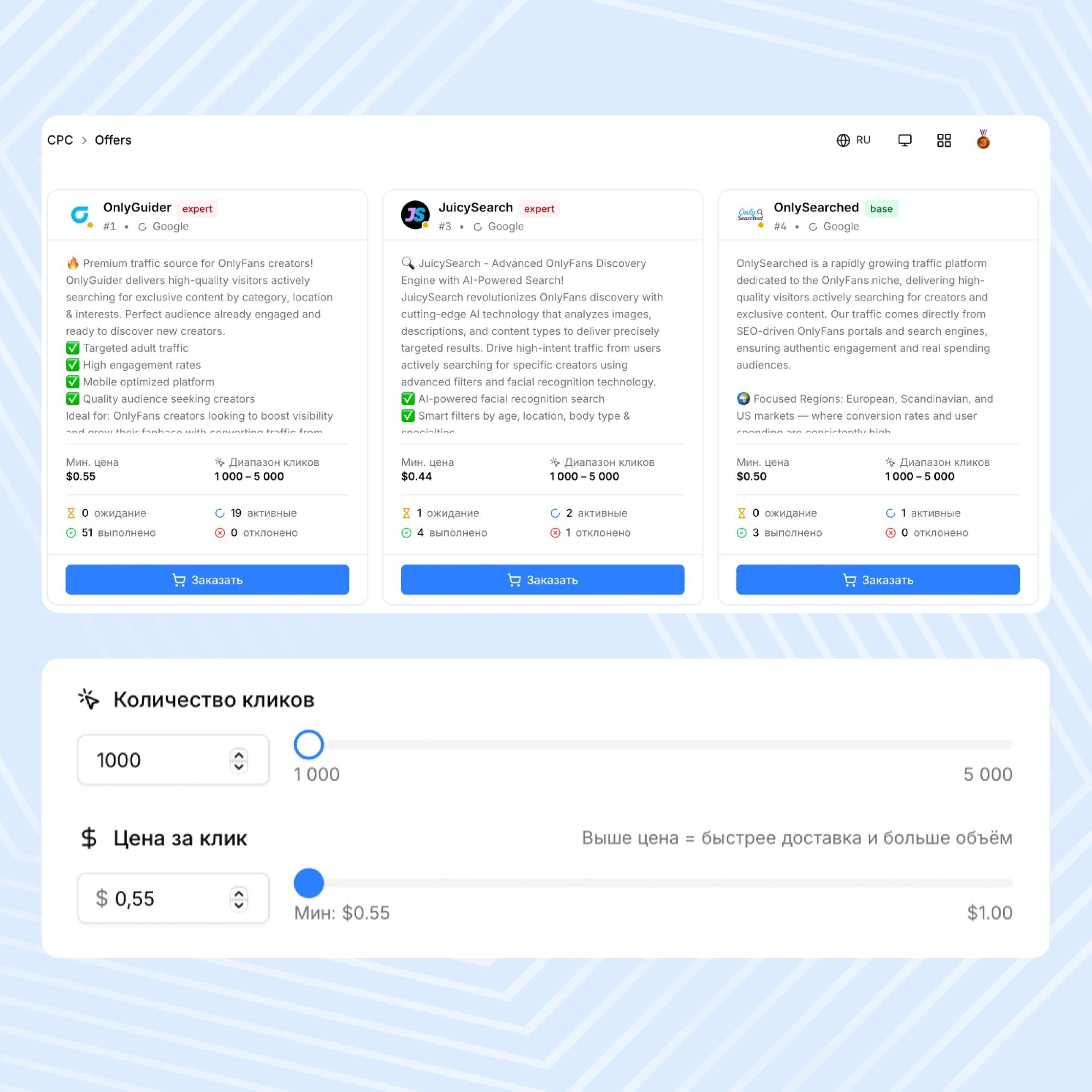 Помимо RevShare и покупки фанатов по CPL, на OnlyTraffic теперь можно купить клики. Сотрудничайте с маркетологами, которые работают только в формате CPC. Такой формат дает возможность управлять объемами трафика: чем выше цена за клик — тем больше трафика, а время доставки сокращается.